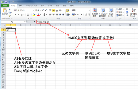 MID関数は文字列の指定した場所から、指定した数の文字を抽出する関数である。