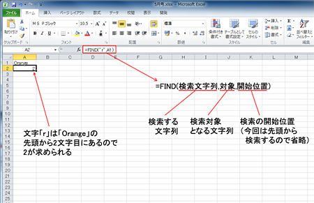 先頭から検索するので、引数「開始位置」は省略している。文字「r」は「Orange」の先頭から2文字目にあるので、2という数値が求められる。