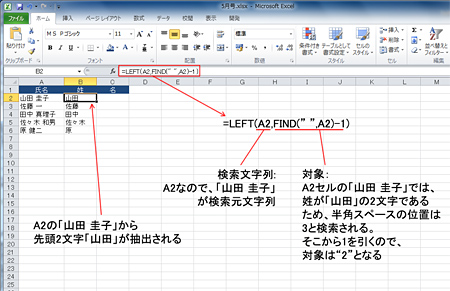 今回は図4のように、姓と名が半角スペースで区切られたかたちで、氏名がA2~A6セルに入力されているとする。B2~B6セルに姓、C2~C3セルに名を取り出したいとする。