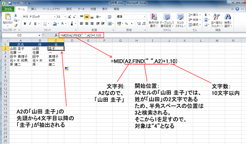 そして、MID関数を用いて、氏名のA2セルを引数「文字列」に指定し、引数「開始位置」に「FIND(" ",A2)」+1」を指定する。引数「文字数」だが、多めの文字列を指定しておけば、その文字数以内で抽出できるようになっている。今回は10を指定するとする。