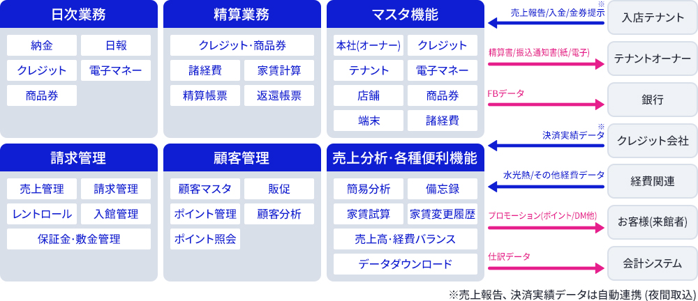 ショッピングセンターの主たる外部システムとの連携実績が多数あります。