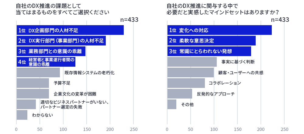 ほとんどの企業がDXの重要性に気づき、生成AIの活用、データアクセスの整備、社内外のシステム連携など、可能なところからDXを進め、成果が出つつあります。しかし同時に、DXの投資予算、評価指標、変革の継続、優先順位など、お悩みを抱える企業も少なくありません。その中でも最も多い悩みである「人材不足、マインド変革」について考えていきたいと思います。