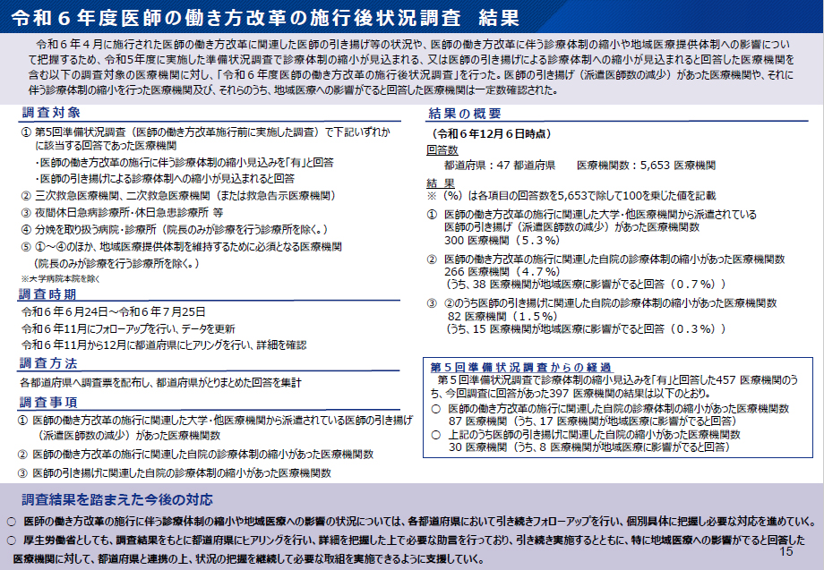 2024年4月に施行された医師の働き方改革から1年以上経過し、現場では様々な課題が浮かび上がってきている。厚生労働省からも以下とおり報告されている。