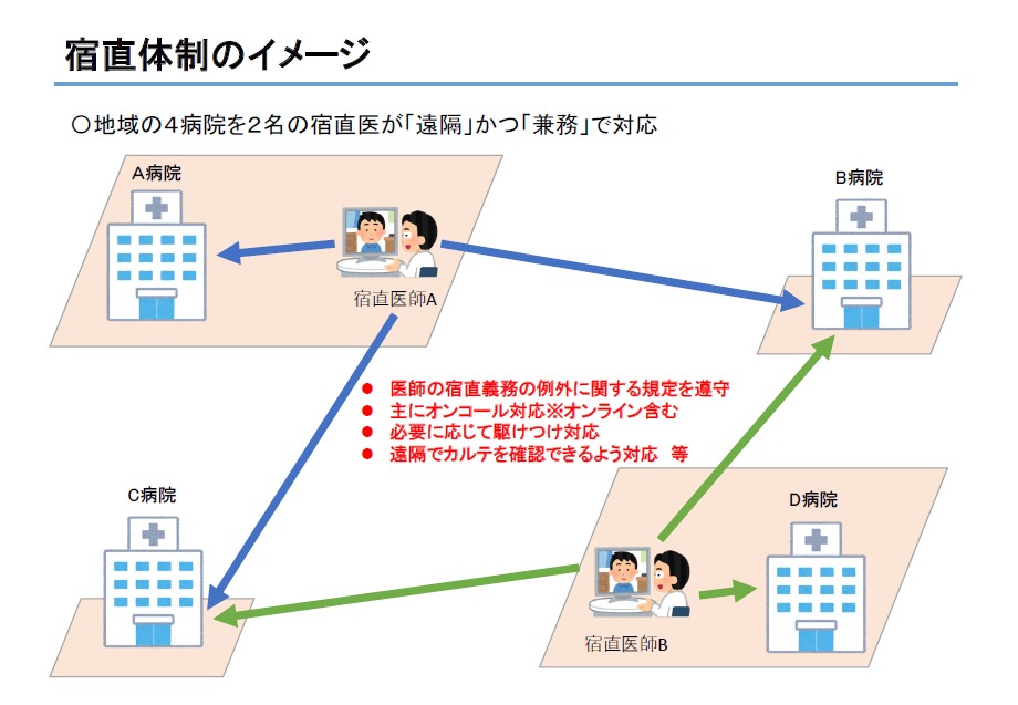 の要件を満たすことを前提に、宿直対応の「遠隔」かつ複数医療機関の「兼務」を行うことを制度上認めてもらいたいというものである。
