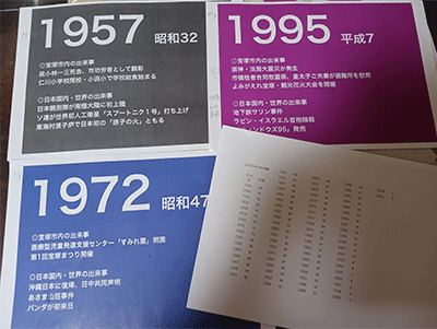 会場には、70年前にさかのぼり、A5サイズ1枚の紙が70年分1年ずつ70枚ずら~りと並び、表には、年号とその年の宝塚の出来事と日本・世界の出来事が幾つか書かれています。その紙を1枚引いて、各自が1分でその年の思い出を語りながら振り返るという志向です。プロジェクターの表示とタイマーは自動で、切替わりに待ったなし。いきなり年号を言われても思い出せませんが、年号の紙の裏に仕掛けがあって、手帳の年齢早見表のように、その時自分が何歳だったかわかるようになっていました。
