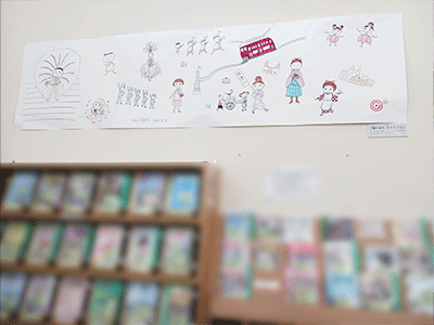 宝塚市立図書館の壁の雑誌コーナーの上に、『ツレがうつになりまして。』の著者である細川貂々さんのイラストが飾られています。