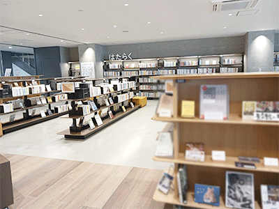 図書館は、大きく「そだつ・くらす・はたらく・うみだす」の4つのテーマ別配架をしています。本の背ラベルは、NDC分類のほかにテーマの棚番号が記載され、棚の本は大きさ順で並べられています。こちらは、「はたらく」コーナー。