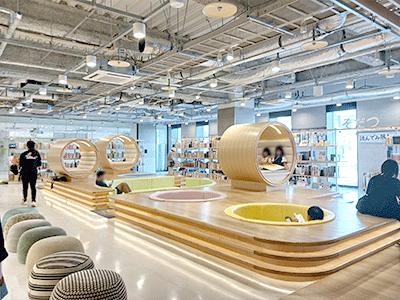 天文館図書館は、2022年4月にオープンした複合商業ビル「センテラス天文館」内に、会話や飲み物も楽しめる新しいスタイルの図書館として開館しました。「天文館の複合施設の中の図書館をどんな位置づけにするのか」、その基本構想の策定支援業務を受託したのが乃村工藝社。元田原市立図書館館長の豊田高広氏が研究員をしているフルライトスペース株式会社が協力会社になっていました。1年半ほどかけて検討し、「みんなをつなぐ図書館」とのコンセプトを打ち出し、テーマ別配架を採用しました。図書館は4-5階で延べ床面積2,120平方メートルという広々した敷地で、指定管理者の図書館流通センター(TRC)が運営しています。