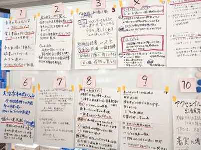次に、対話(ダイアローグ)では、少人数のグループ(4~5人)に分かれ、自分がメモした付箋を貼りながら、感じたことや疑問に思ったことなどを伝え合いました。正解を追求するのではなく、解釈のずれも確認し合います。山本氏は早くに認定ファシリテーターを取得しただけにABDへの想いも強く、「ABDは一人で水をすくうのではなく、水を交換する場」と、オリジナリティあふれる表現をしました。まさに、対話の中でさらに解釈が深まっていくのを感じました。