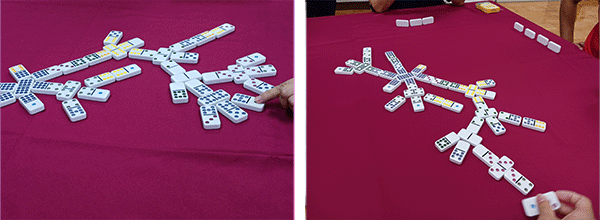 ドミノといえばドミノ倒ししか知らなかったのですが、ほかにもいろいろな遊び方があるのです。ゲームのルールはいたって簡単。パイには2つの数字があって、基本は同じ数字がつながるように手持ちのパイを捨てていきます。出せるパイがない時はパイを補充。ぞろ目のパイが出されたら呪いがかかり、ルールが変更になり複数の枝が発生します。すぐに飽きるかと思いきや、繰り返しの学習効果で、回数が深まればそれなりに先読みしたりする楽しみもありました。ゲームが終わるごとにジャラジャラとパイをかきまぜる間の会話も弾み一体感が出てきます。当たり前だけど、各回ででき上がるパイの形も違います。