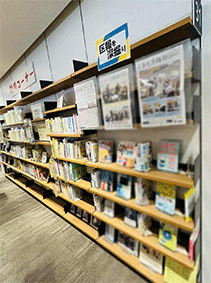 9階、10階には現代の里山をコンセプトとしたテラス席があります。9階には一般書架だけでなく図書館司書が毎月作成しているテーマ展示コーナーや近隣の昭和医科大学病院の医療スタッフが推薦する本のコーナー(医療スタッフの顔写真つきブックリストも展示・配布)、区報の記事に関する本のコーナーなど。地域との連携や利用者の興味を引く司書の工夫が見られました。