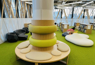 10階は児童開架、YAコーナー。絵本コーナーは段差や斜面を取り入れ、遊びながら本と親しめる設計です。YAコーナーにある閲覧席は、シニア層やビジネスマンや学生の利用も多いと聞きました。「図書館は静かな場所」と思っている方は一定数います。広くない館内での騒音への気配りに、身内目線で司書の大変さを感じました。